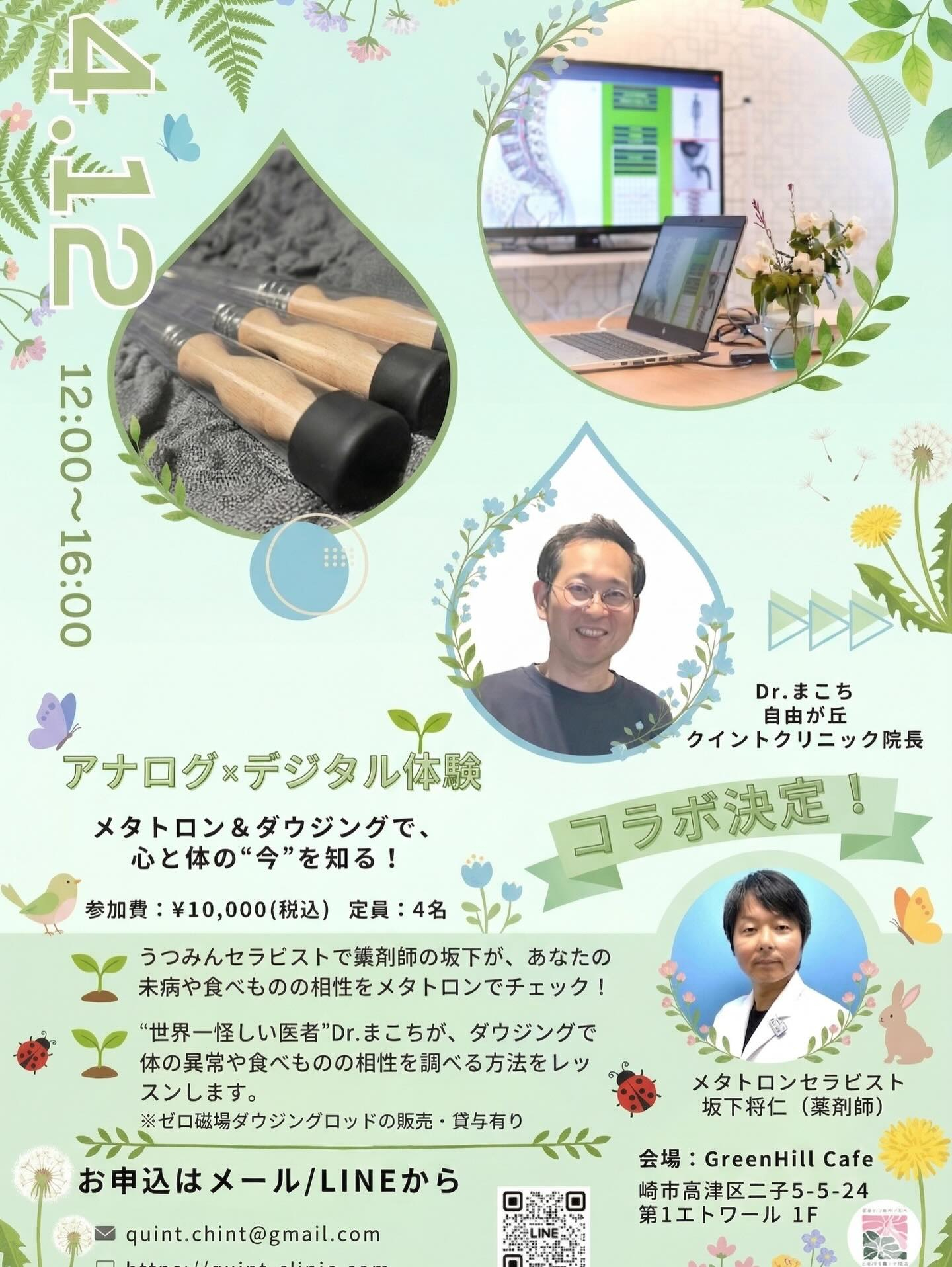 【2月・3月のダウジング講座のご案内】【2月・3月のダウジング講座のご案内】 GreenHill Cafeにて メタトロン × ダウジング 心と体の声を聞く、特別コラボ体験会を開催します✨ 薬剤師で“うつみんセラピスト”の坂下将仁さんと、 “世界一怪しい医 […]